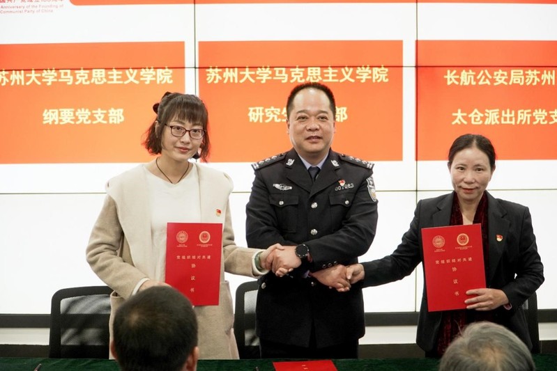经过前期充分友好协商,苏州大学马克思主义学院纲要党支部、研究生党支部、长江航运公安局苏州分局太仓派出所党支部从即日起正式确立党组织共建合作关系。活动中,纲要党支部范敏华书记、研究生党支部金鑫书记、太仓派出所党支部陈新平书记共同签订支部共建协作协议,三方表示将马克思主义理论学习、习近平生态文明思想践行和长江生态保护实践紧密结合,共同为长江经济带发展注入连绵不断的党员力量。