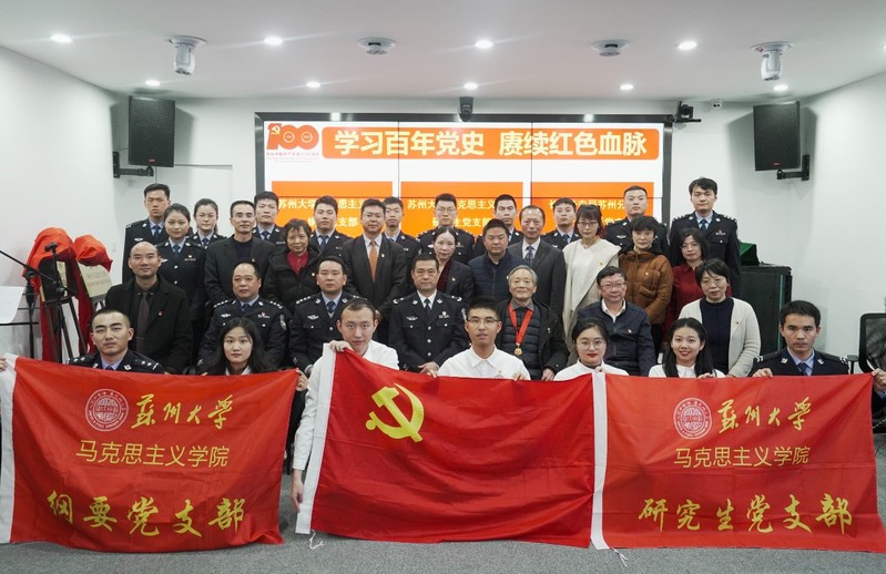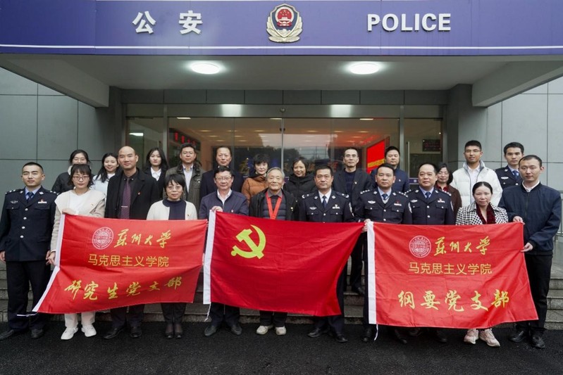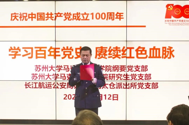 为深入学习党的十九届六中全会精神,贯彻落实《中共中央关于党的百年奋斗重大成就和历史经验的决议》,推进党史学习教育走深走实,融合推进“两在两同”建新功行动与“我为群众办实事”实践活动,为“长江生态环境大保护”贡献力量,12月12日,苏州大学马克思主义学院纲要党支部、研究生党支部联合长江航运公安局苏州分局太仓派出所党支部共同开展“红色精神入人心长江生态保护行”主题党日活动。长江航运公安局苏州分局副局长何健、政治处副主任张宁、太仓派出所党支部书记陈新平,苏州大学马克思主义学院党委书记陈建军、副院长朱蓉蓉和茆汉成、纲要党支部书记范敏华、支委委员胡小君和高志斌、研究生党支部书记金鑫、纲要教研室主任孙锡平以及纲要党支部党员教师,长江航运公安局苏州分局太仓派出所支部党员及马克思主义学院研究生支部部分党员参加了此次活动。